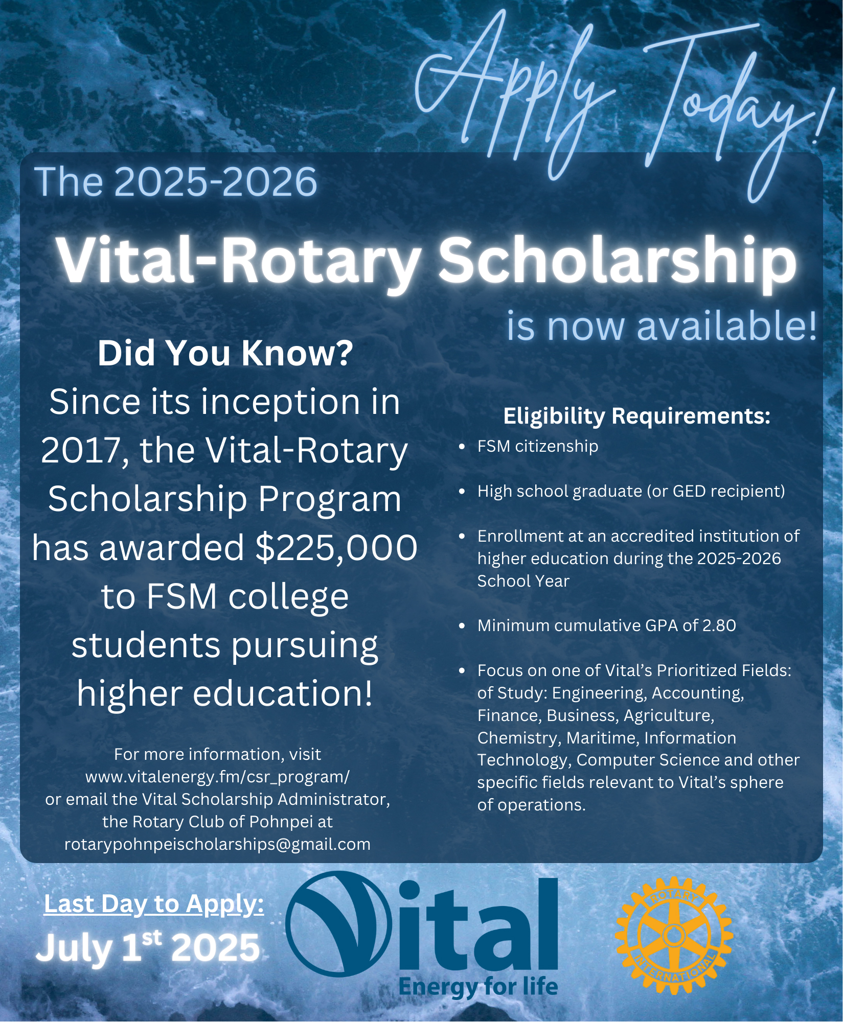 The Rotary Club of Pohnpei is now accepting scholarship applications for the 9th Vital-Rotary Annual Scholarship for the School Year Fall 2025 and Spring 2026!